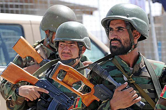 阿富汗士兵在阿富汗南部乌鲁兹甘省巡逻。