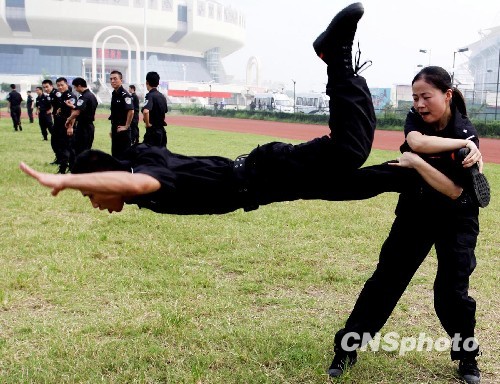 8月16日,安徽淮北市公安局特警支队开展“迎国庆大练兵”活动。公安特警开展了反恐战术、擒敌术、攀爬越障等课目的训练,提高治安防范和应对突发事件的快速处置能力。中新社发 张红心 摄