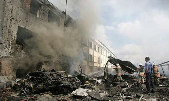消防员在爆炸现场展开工作。