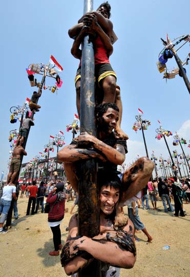 8月17日,近2000名年轻人在印尼首都雅加达一个公园内参加爬杆大赛,庆祝国家独立64周年。