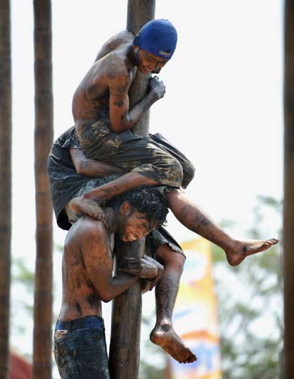 图:印尼上千民众“爬杆”庆祝独立日(2)