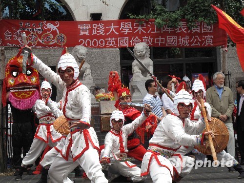 此次义演邀请到了一个特殊演出团队——台湾实践大学宋江阵代表队,这支刚刚参加完著名的爱丁堡艺术节的台湾文化精品表演团,今天来到伦敦华埠,在为当地华人华侨呈现其精美艺术的同时,也为远在家乡的同胞献上了一份爱心。中新社发 魏群 摄