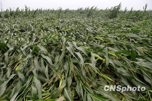 山东省枣庄市山亭区遭遇风暴灾后的玉米地如同碌碌碾过一般。中新社发 李宗宪 摄