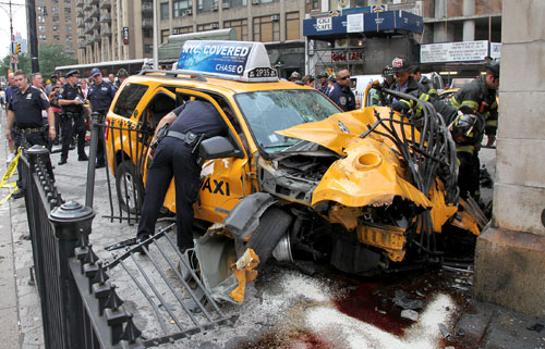 8月18日,美国纽约市内一辆计程车撞上第72街与百老汇相邻的地铁站,3人受伤。图为急救人员在现场进行救援。
