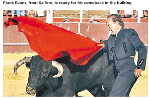 据英国《泰晤士报》18日报道,现年67岁的英国老汉是有史以来年龄最大的斗牛士,过去40多年中他经常到世界各地比赛,直到2005年才因为膝盖受伤而退出斗牛场。装上“钛膝盖”的埃文斯仍将于8月30日重返西班牙斗牛场,与一头重达500公斤的凶猛公牛作战!