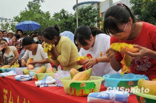 8月19日,在云南芒果之乡华坪县,几名选手正在进行吃芒果比赛。18日至20日,“2009年首届丽江华坪芒果文化节”在云南华坪县举行。活动期间,将举行大型文艺表演、民族歌舞表演、参观芒果示范园、芒果产业发展论坛及相关商务活动。中新社发 李良华 摄