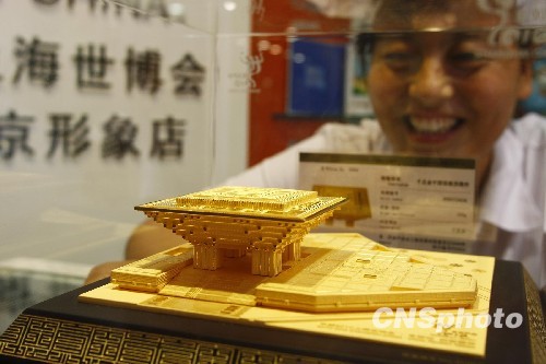 8月19日,工作人员在展示世博“纯金中国馆”。近日,全球首款上海世博会“纯金中国馆”产品在北京王府井工美商场上市,受到众多收藏爱好者的追捧。中新社发 郑雄增 摄