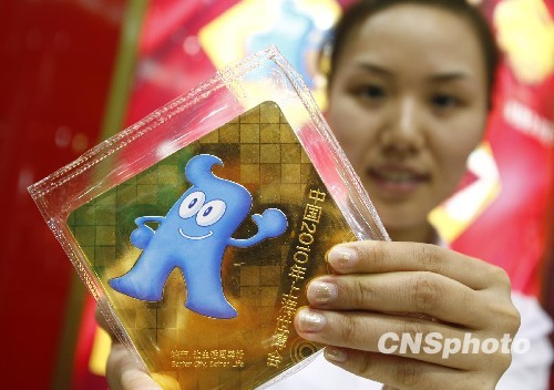 8月19日,工作人员在展示“世博金砖”。近日,上海世博会“金银砖”系列产品在北京王府井工美商场上市,受到众多收藏爱好者的追捧。中新社发 郑雄增 摄