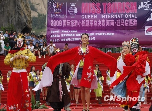 8月19日,“2009国际旅游小姐”巡游至西游记外景拍摄地——河南驻马店嵖岈山,一位佳丽按中国传统习俗,穿上嫁衣,给“猪八戒”当了“新娘”。