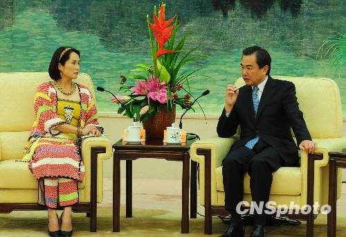 8月19日下午,中共中央台湾事务办公室主任王毅(右)在北京人民大会堂台湾厅接见台湾少数民族代表高金素梅一行。王毅表示,中台办为台湾风灾地区筹集了2000万元人民币的善款,愿意提供给受灾的台湾同胞。中新社发 侯宇 摄