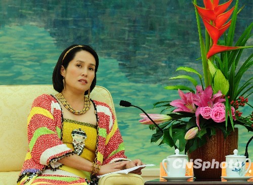 8月19日,中共中央台湾事务办公室主任王毅在北京人民大会堂台湾厅接见了台湾少数民族代表高金素梅等一行,高金素梅对中台办对台湾少数民族同胞受风灾影响状况的关心表达了谢意。中新社发 侯宇 摄