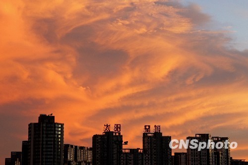 2009年8月19日傍晚,雨后的北京城出现火烧云奇观。中新社发 余明 摄
