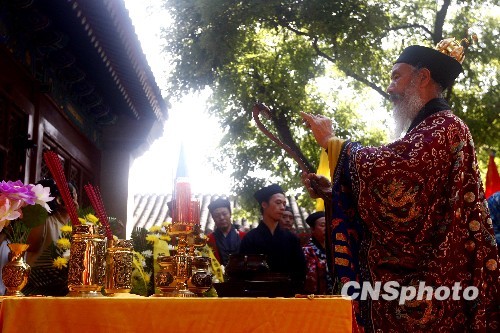 图为北京白云观举行海峡两岸三地道教界为台湾“8·8”风灾水灾祈福解厄追荐法会暨捐赠善款仪式。中新社发 杜洋 摄