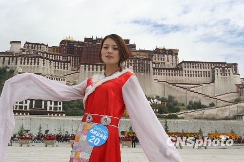 图为参加亚姐决赛的佳丽在布达拉宫广场担当义务礼仪小姐。中新社发 柳俊武 摄
