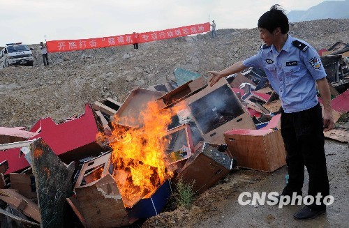 8月20日,福州警方在仓山区城门镇黄山集中销毁缴获的赌博机248台及赌博游戏机芯片815片,总价值约110万元人民币。据了解,2009年7月至今,福州警方开展打击赌博违法犯罪活动专项行动,重点打击赌场开设者、聚众赌博的组织者、电子游戏机赌博的经营者、涉赌违法犯罪活动的“保护伞”。中新社发 刘可耕 摄