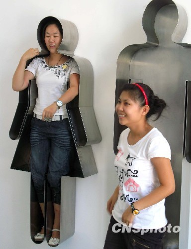 8月20日,女青年在北京798艺术区饶有兴趣拍摄特殊行为艺术图片。中新社发 邹宪 摄
