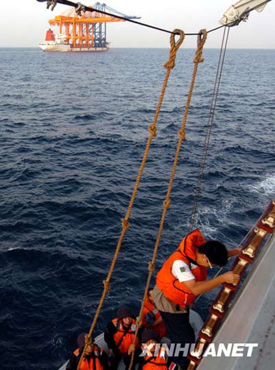 8月20日,中国海军第三批护航编队“舟山”号导弹护卫舰战士从左舷登上舰载快艇,准备为“振华14”号商船实施随船护卫。