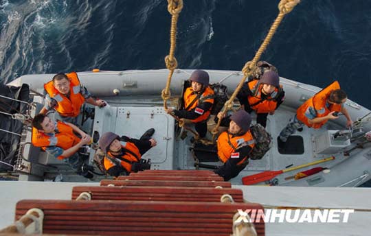 8月20日,中国海军第三批护航编队“舟山”号导弹护卫舰战士从左舷登上舰载快艇,准备为“振华14”号商船实施随船护卫。