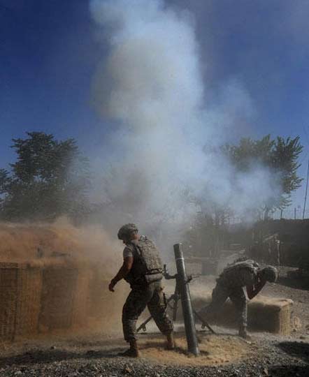 8月20日,在阿富汗的卢格尔省至少有6个投票中心遭到武装分子袭击,美军和阿富汗国民军对武装分子实施了反击。图为美军士兵向袭击投票中心的武装分子发射迫击炮。