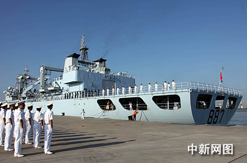 “微山湖”号综合补给舰历时八个月护航任务凯旋归来,停靠于湛江某军港码头。中新社记者 孙自法 摄