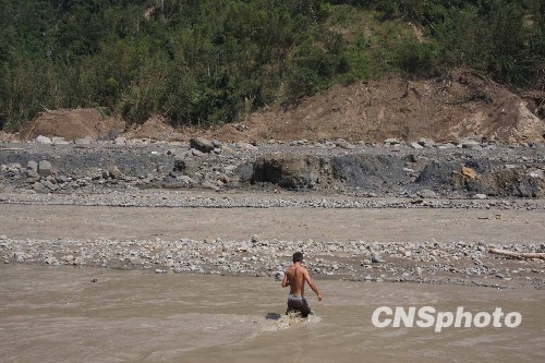 中新社驻点记者近日深入台湾“88风灾”受创最深的高雄县甲仙乡采访,所见所闻令人感怀。图为一名小林村村民涉水,欲趟过湍急的溪水,河的对岸据报发现3具遗体。小林村日前遭遇泥石流,据称有460多人被埋。中新社发 董会峰 摄