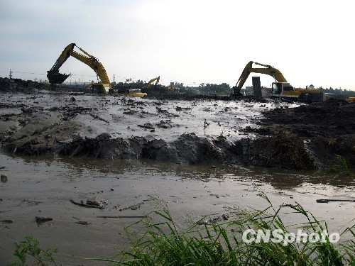 8月21日,位于台湾屏东县佳冬乡的受灾民众活动板房搭建区域加紧整地,当地将搭建起首批一百户大陆捐赠的活动板房。图为挖掘机在施工现场加紧作业中。中新社发 刘舒凌 摄