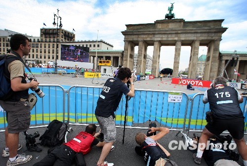 当地时间8月21日中午,第12届国际田径联合会世界田径锦标赛男子50公里竞走比赛在柏林市中心的勃兰登堡门举行,摄影记者为了猎取与众不同的镜头,各显神通。中新社发 任晨鸣 摄
