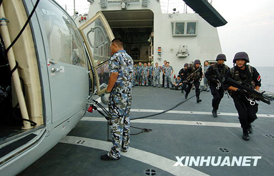 21日18时15分(北京时间23时15分),中国海军第三批护航编队“舟山”舰在亚丁湾海域执行护航任务时,利用舰载直升机运送了4名特战队员前往浙江省舟山市卫丰船务有限公司的“卫远”号商船上实行随船护卫,解除了船上26名船员的安全顾虑。图为“舟山”舰4名全副武装的特战队员正在登机准备实施随船护卫。郭刚摄
