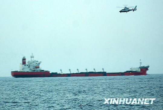 搭载着4名特战队员的“舟山”舰舰载直升机前往“卫远”号商船实施随船护卫。