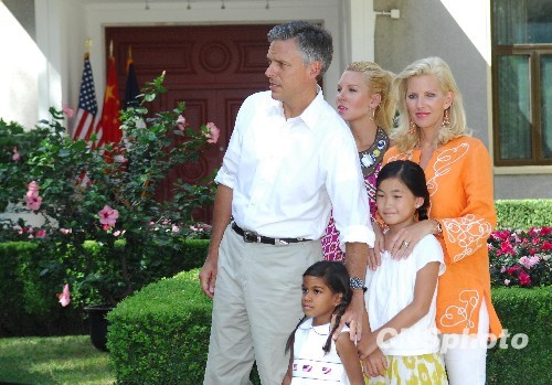 8月22日,美国新任驻华大使Jon Huntsman(中文名:洪博培)在北京美国大使馆新闻处举行到任媒体会。洪博培发表了履新感言并介绍了自己的家人。图中前排为洪博培在印度收养的女儿阿莎、中排左一为洪博培、左二为在中国扬州收养的女儿杨乐意、后排左一为大女儿玛丽安、左二为妻子玛丽。中新社发 侯宇 摄