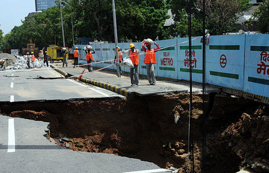8月22日,在印度首都新德里,施工人员正在将沙袋填进塌陷地点。21日,新德里遭暴雨袭击,导致市中心一地铁施工地路面塌陷,形成一个近十米深的大坑。