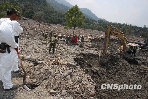 8月22日,台湾“八八水灾”进入第14天,中新社记者长途奔波,深入受创深重的高雄县六龟乡新开部落采访。图为救援人员正用大型“怪手”结合人工,加紧挖掘罹难者遗体。这里被泥石流活埋28人,迄今只寻获4具遗体。中新社发 董会峰 摄