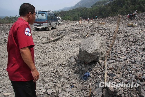 图为一名救灾小队长来到现场,木棍竖立处,据闻很可能深埋着他的岳母,挖掘大体的工作将很快展开。中新社发 董会峰 摄