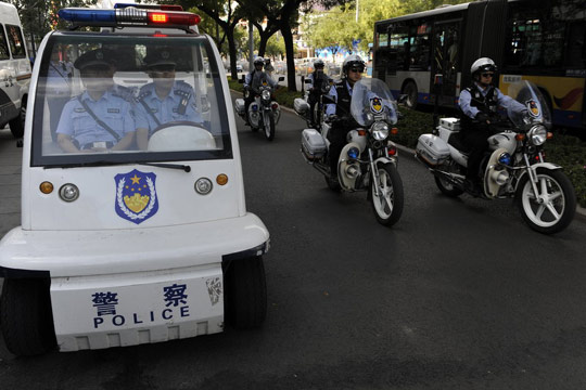 8月22日,北京,民警的巡逻车和巡警的摩托车按照巡逻路线进行巡逻。