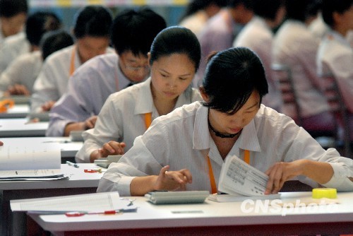 8月22日,上海银行举办“迎世博,强素质,比技能”员工业务技能比赛。随着世博会临近,上海社会各界参与世博的热情高涨,“迎世博2009年上海市职业技能大赛暨百万职工技能大练兵”活动在申城各行各业如火如荼地进行。沪上金融从业者踊跃参加技能竞赛,为公众与2010年上海世博会的游客提供优质服务。中新社发 海牛 摄