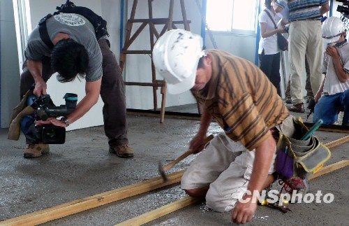 8月23日,台湾展开灾民安置临时建筑的兴建工程。台湾方面在搭建工作中遇到不少细节障碍,深圳雅致集成房屋公司工程部经理杨云等三名大陆技术人员将为搭建工作提供技术支持,并对现场施工人员进行培训。图为台湾施工人员准备搭建活动板房隔间。中新社发 刘舒凌 摄
