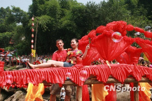 8月23日,来自全国各地的56对民族情侣共度在重庆江津举行的“第二届中国七夕东方情人节”。当天下午,56对民族情侣携手同过中山古镇的“鹊桥”。图为美国年轻小伙子一把抱起中国新娘幸福过鹊桥。中新社发 孟幻 摄