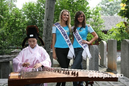 8月23日,河南登封嵩阳书院,一名身着宋朝服饰的女子用古筝弹奏着中国古老的名曲《梁祝》,吸引了前来参观的国际旅游小姐。中新社发 王中举 摄