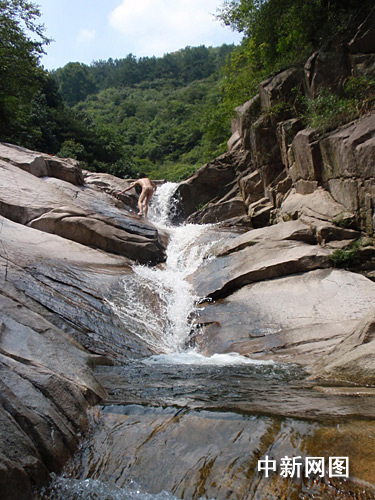 在河南新县金兰山九龙潭景区,一名游客将自己融入到了悬泉飞瀑之中,尽情享受起了大自然给人带来的无穷魅力,上演了一幕瀑布人体秀。