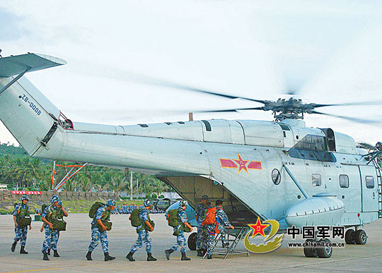 盛夏南海某机场,碧空如洗,微风吹拂。这天上午7时,一颗绿色信号弹升起。海军某部几十名全副武装的官兵快速登上某型直升机。