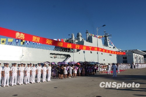 图为官兵列队欢迎“微山湖”舰。中新社发 刘林 摄