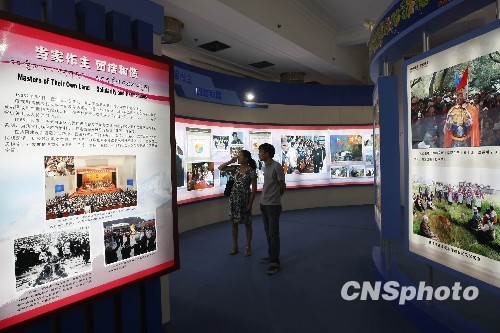 图为参观者在西藏自治区成就展展厅内仔细观看。中新社发 盛佳鹏 摄