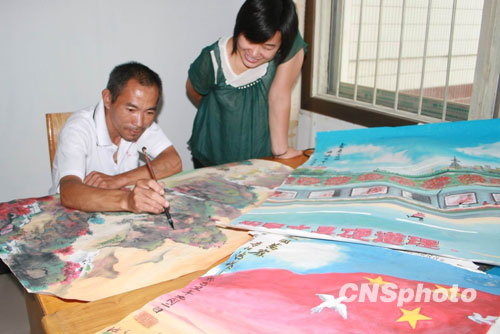 8月25日,河南内乡县王店镇四张村的农民画家李江鸿给村民们免费作画。据悉,李江鸿已经作画近百幅,主题是庆祝建国60周年,素材都来自田间地头,反映农村的新变化、新气象。