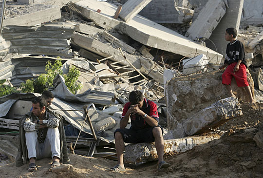 8月25日,死者家属座在一片废墟上哀悼亲人。