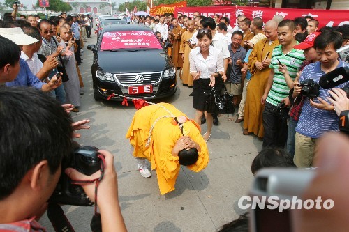 8月25日,河南省开封市年过5旬的张婷婷轻松地用发辫拉着坐有8名司机的8辆小轿车前行20多米。据悉,张婷婷为河南开封人,17岁开始练武,1989年成为少林寺俗家弟子,修行少林佛法和武功。25日下午将在河南开封大相国寺受戒。
