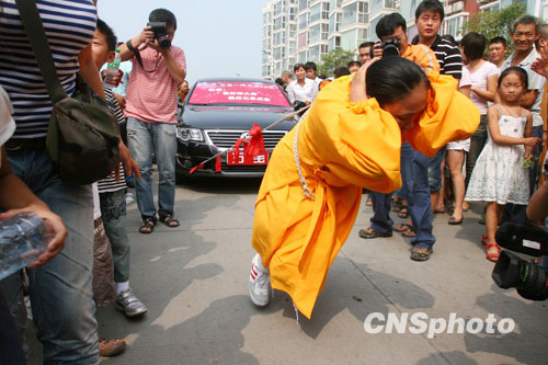 图为52岁的张婷婷正在用头发拉动8辆汽车。中新社发 李俊生 摄