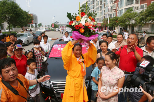 图为52岁的张婷婷在用辫子拉动8辆汽车后与众人分享快乐。中新社发 李俊生 摄