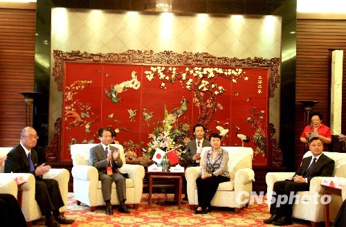 8月25日晚,新任扬州市委书记王燕文(右二)、代市长谢正义(右一)在扬州迎宾馆会见前来出席第八届中日地方交流促进研讨会的日本自治体国际化协会专务理事上田纮士(左二)、日本奈良县知事荒井正吾(左一)、德岛县副知事里见光一郎、日本驻上海总领事横井裕以及中国外交部外管司司长陈育明、中国社科院金融研究所所长李扬等会议代表。中新社发 崔佳明 摄