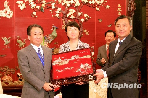 8月25日晚,新任扬州市委书记王燕文(中)、代市长谢正义(右)在扬州迎宾馆会见前来出席第八届中日地方交流促进研讨会的日本自治体国际化协会专务理事上田纮士(左)。中新社发 崔佳明 摄