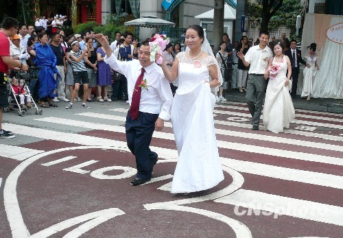 8月26日农历七月初七是中国传统的七夕情人节,成都市残联和成都市婚庆行业协会共同为来自地震灾区都江堰、彭州、崇州等地的12对残疾新人举办集体婚礼。此举是成都市残联今年推出的为灾区残疾人送物资、送就业岗位、送职业培训、送文化等“五送”活动之一。中新社发 王俊 摄